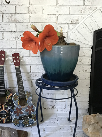 Last year this bulb sent up an amaryllis stem and flower that was three feet tall. This year, it did not have enough steam, so it grew an interesting curled stem. (Those are the ukes we brought back from Rapa Nui. They sound awful but look great.)